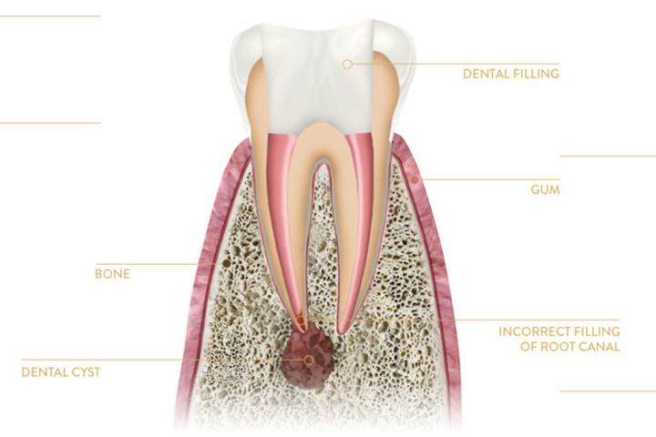 Apical resection is the removal of the cyst or infection that occurs in the root of the tooth by cutting off the tooth root by operation.